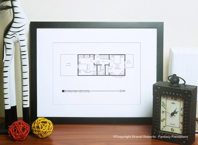 My All in the Family house floor plan poster features the second story of Edith & Archie Bunker's Queens, New York home. It's very basic with two bedrooms and one bath. Gloria and "Meathead's" bedroom features a built-in bookcase next to the closets.