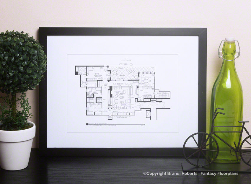 Are you looking for a unique Mad Men TV show gift? My fictional floor plan for the swanky Park Avenue apartment of Megan and Don Draper features the best of 1960s and mid-century modern home décor; and is a great gift for any TV lover! Their apartment features a sunken living area, three bedrooms, two and half baths, kitchen and dining room. There’s also a large balcony with stunning views of the Manhattan skyline and the city smog.