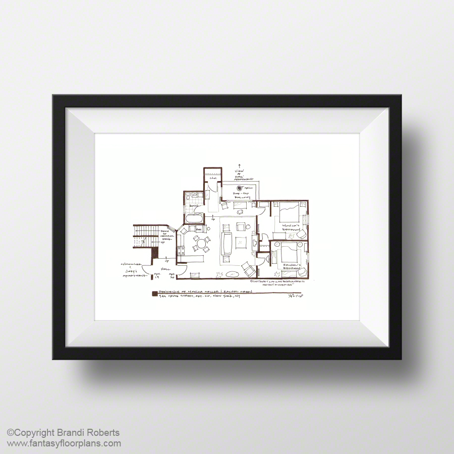 This is an original hand-drawn sketch by Brandi Roberts of Monica Geller and Rachel Green's Big Apple apartment. Archival black ink on 11"x17" translucent paper. Signed by the artist. Shipped flat.