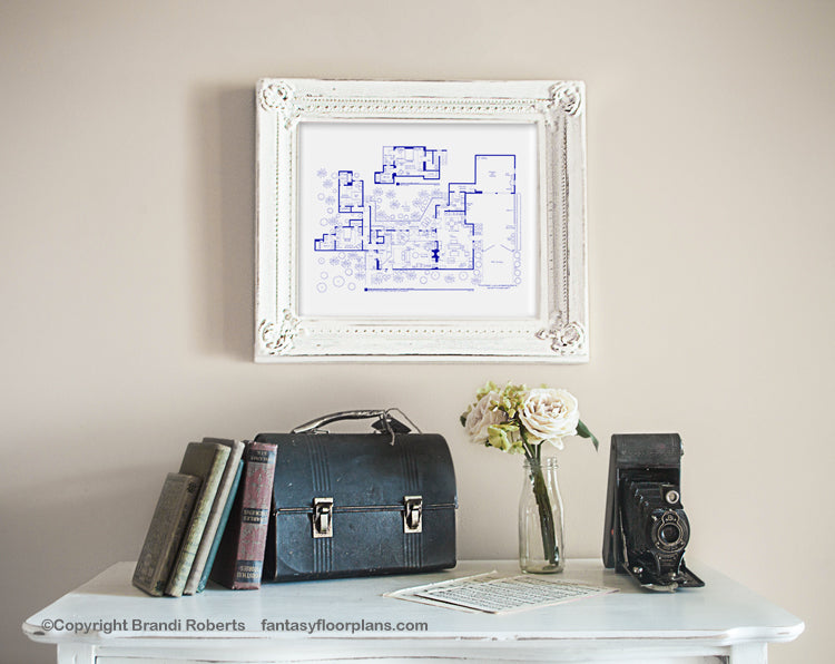 My Two and Half Men house floor plan for the lovely beachfront abode of Charlie Harper makes a great TV show gift or art for your walls! My Two and Half Men fictional floor plan features three bedrooms and 3.5 baths. Master suite upstairs features full bath, walk-in closet and balcony. Large living room with access to terrace features sweeping views of the ocean. Open floorplan kitchen and den make a great area for entertaining. Double car garage oddly faces the Pacific ocean. Lush tropical landscaping. My Two and Half Men house layout is detailed and completely hand-drawn and will look great in your home or office!